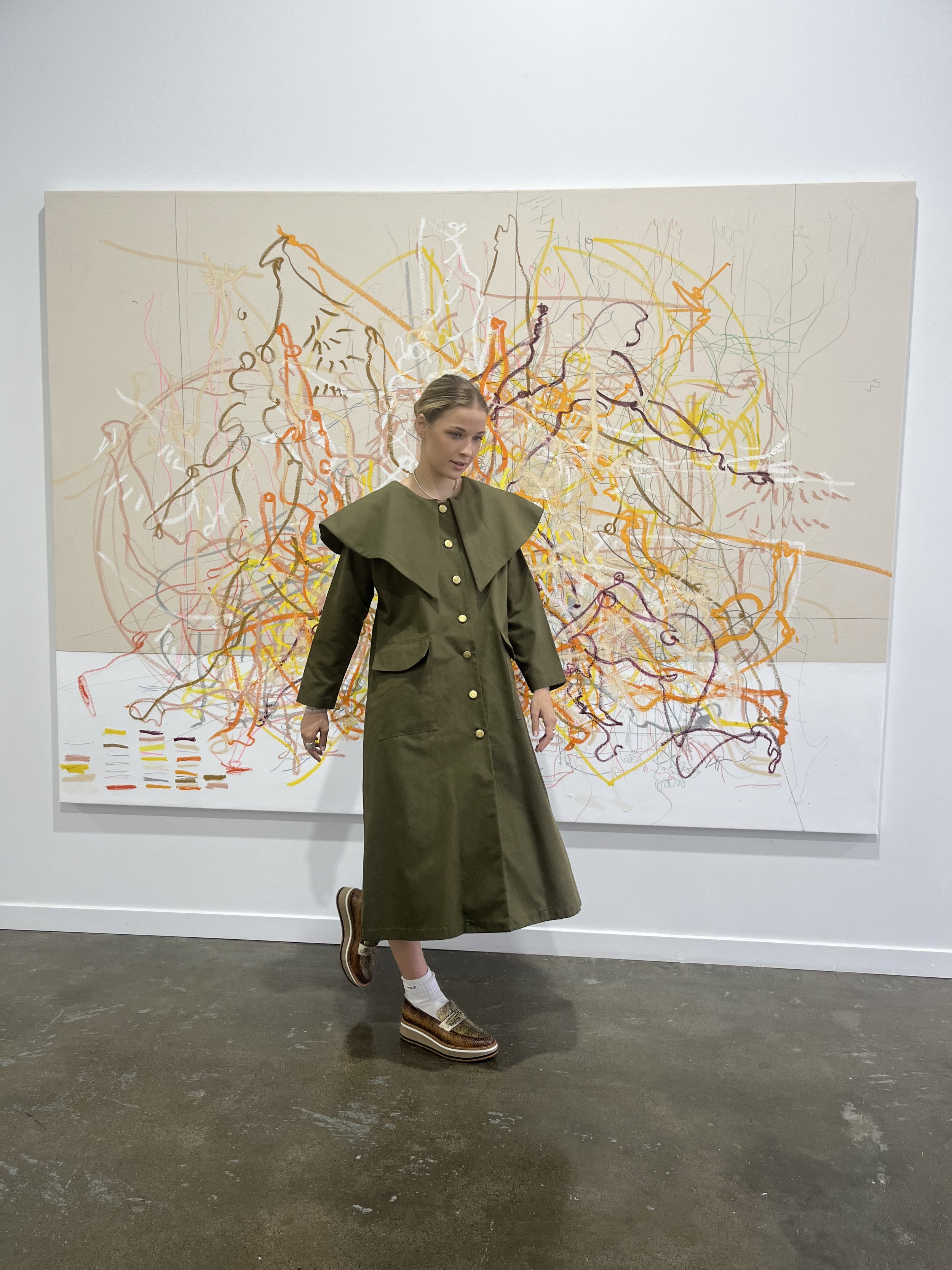 When I spied this thick khaki green fabric, I knew I had found the perfect canvas to give a nod to the classic trench coat with a modern feel. Incorporating utilitarian patch pockets and lengthening the original hemline were my other customizations that complemented this vision.